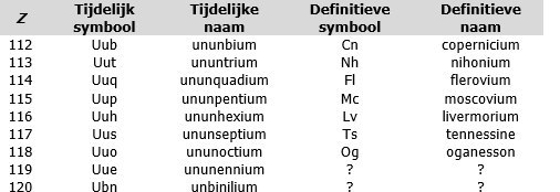 Vanaf element 119 bestaat het voorlopige symbool uit drie letters, die de cijfers van het atoomnummer voorstellen. De bijhorende voorlopige naam wordt via onderstaande tabel en de uitgang ‘ium’ gegenereerd.